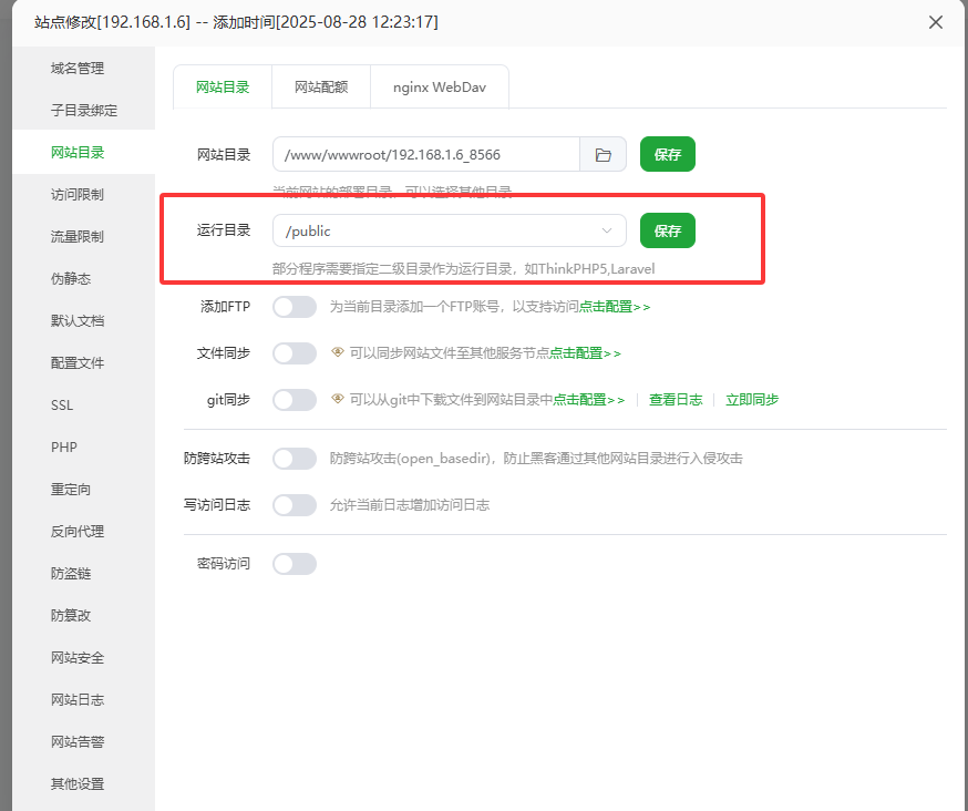 其中有个最重要的点,在网站目录里面需要把运行目录改为public