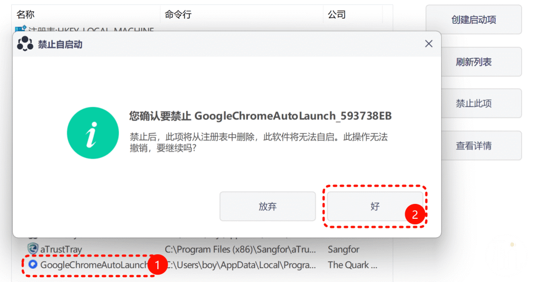 • 完成:该软件将从启动项列表中消失,此后开机时将不再自动运行。
